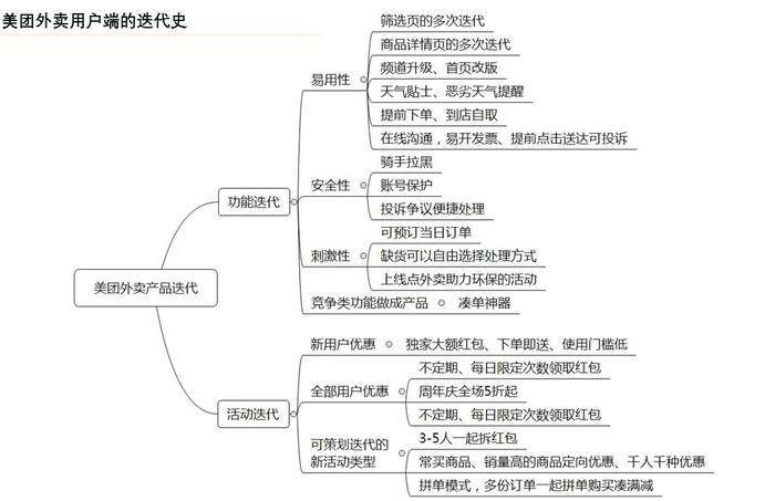 從上圖看到,美團外賣產品功能迭代方向主要分為兩類:功能迭代和活動迭代。功能迭代以豐富安全性、易用性功能為主,活動方面以激勵消費為主,當然美團還推出了一些創新功能:智能助理和滿減神器,這兩個功能可以說是比較新穎的,足見美團在功能方面的投入。